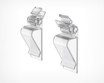 Universal ratchet clip for fixing plastic frames on shelves, box and basket edges.